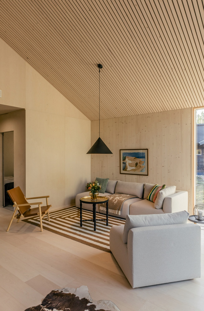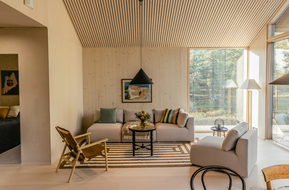 Tilava olohuone, jossa on suuret ikkunat, joista avautuu näkymä metsään. Sisäkatto ja seinät ovat vaaleaa puupaneelia. Huoneessa on vaaleanruskea Hakolan Frame-matto, vaalean beigen värinen Hakolan Puzzle-nojatuoli ja lattiavalaisin. Ikkunoiden kautta näkyy terassi ja metsä.