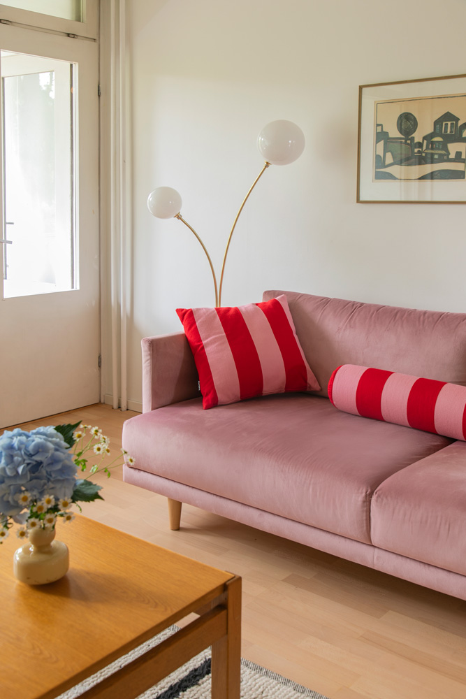 Tämä kuva esittää olohuonetta, jossa on vaaleanpunainen sohva, ja sen päällä on kaksi tyynyä: yksi kuviollinen ja toinen punavalkoraidallinen. Sohvan vieressä on messinkinen lattiavalaisin, jossa on kaksi valkoista lasipalloa. Sohvan takana on seinällä kaksi kehystettyä taulua. Huoneessa on suuri ikkuna, jonka edessä on viherkasveja ja yksi tuoli. Ikkunan vieressä on parvekeovi, joka on auki. Lattialla on vaalea matto, jossa on mustia viivoja.